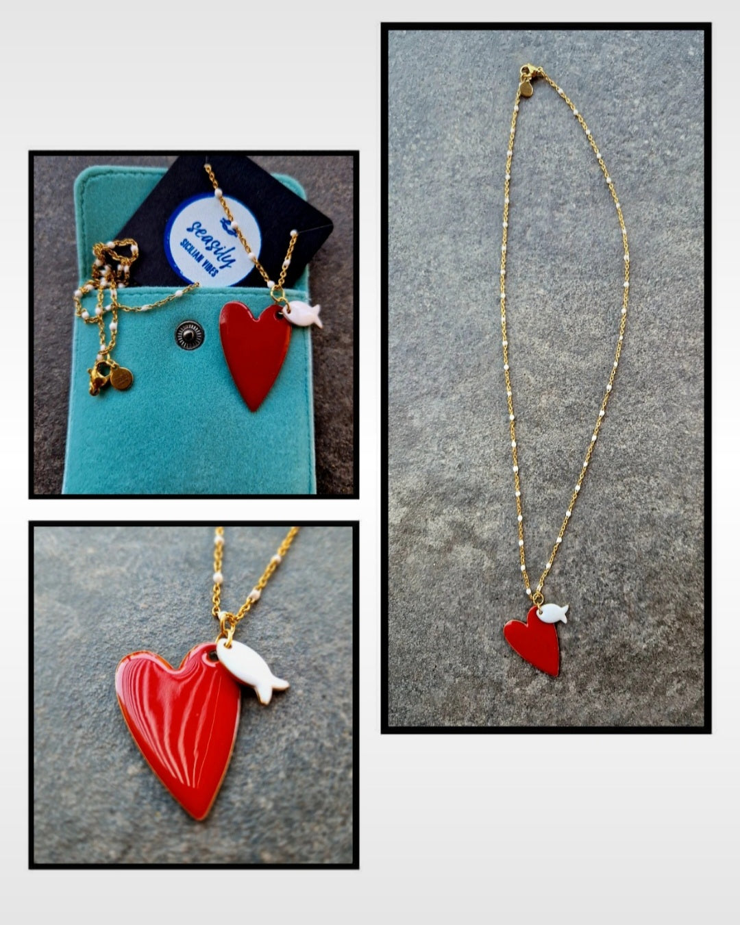 Collana con catenina con perline bianche e ciondolo grande cuore e pesciolino smaltato