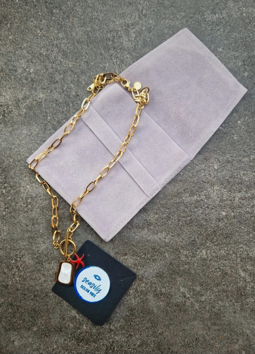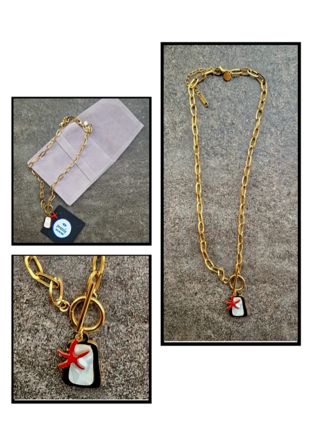 Questa splendida collana Asteroidea presenta un tag rettangolare madreperla e un incantevole ciondolo a forma di stella marina, il tutto in un elegante rosso. Porta con te un pezzo di mare e un look unico e sofisticato. L'accessorio perfetto per ogni occasione.