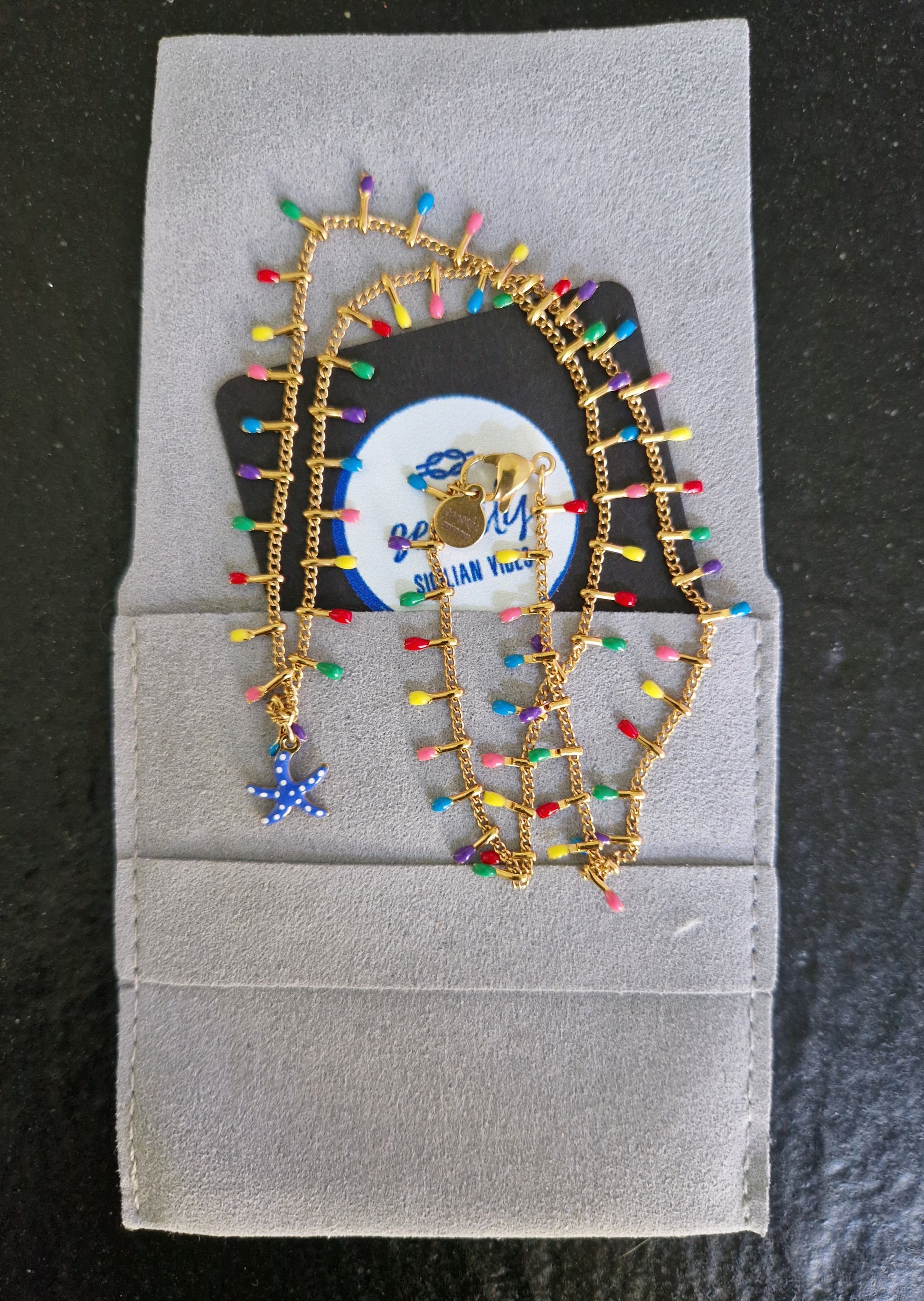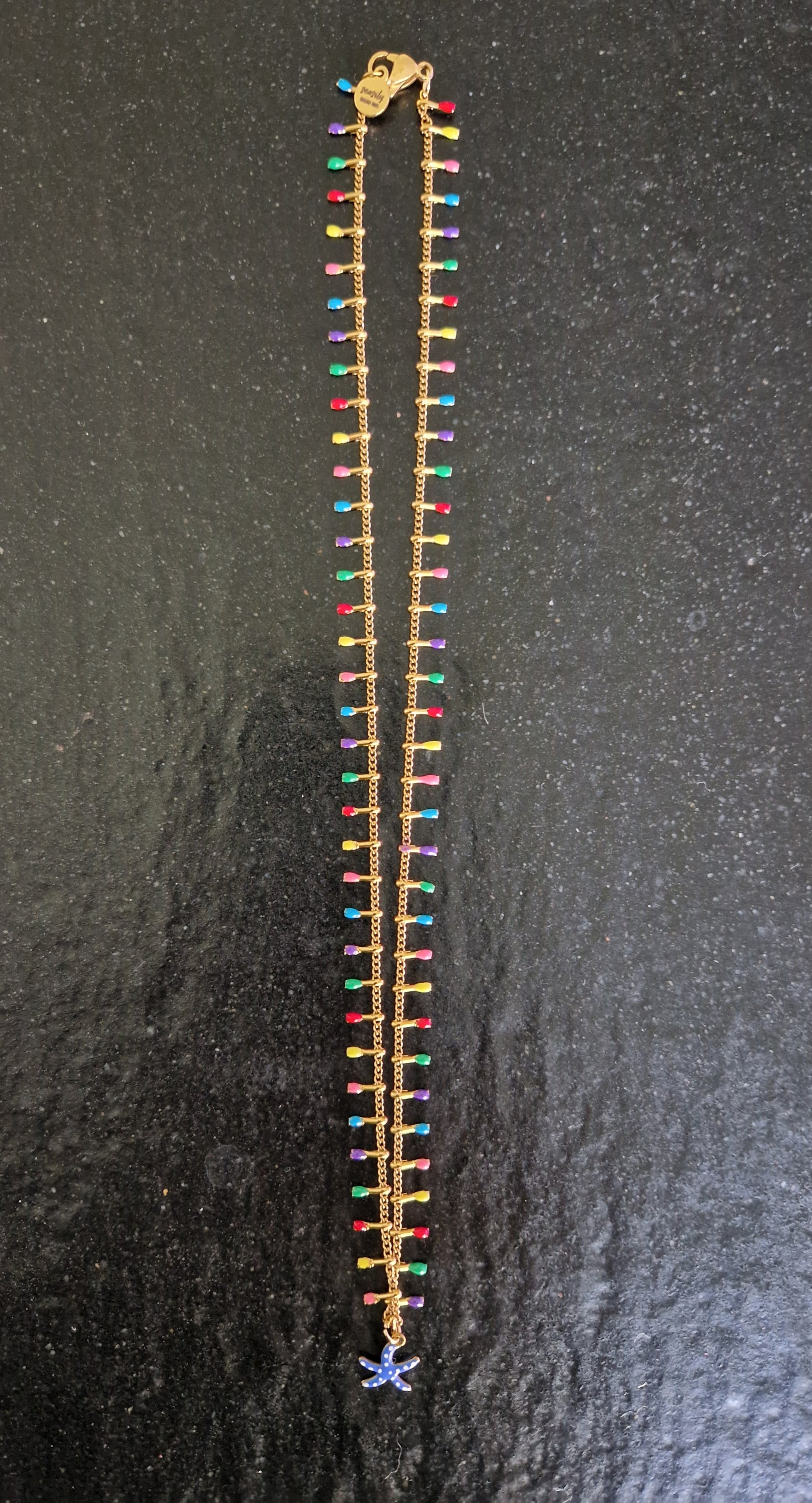 La collana Astrid è un divertente girocollo con perline colorate arricchito da un simpatico ciondolino smaltato a pois.