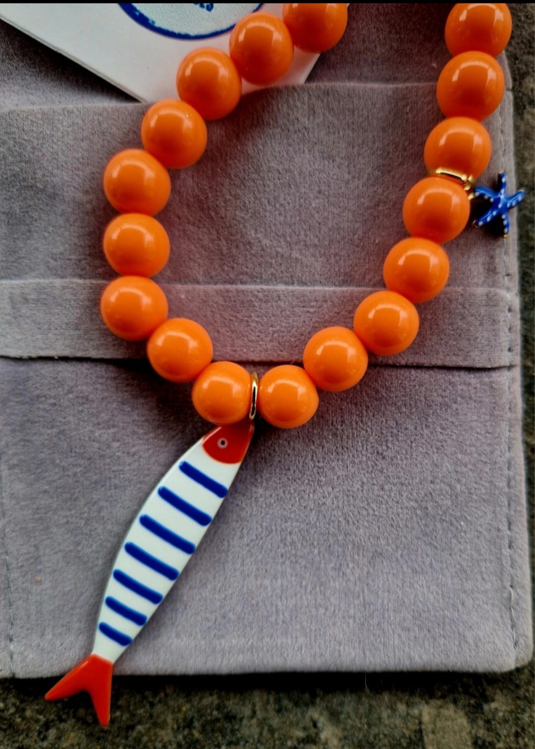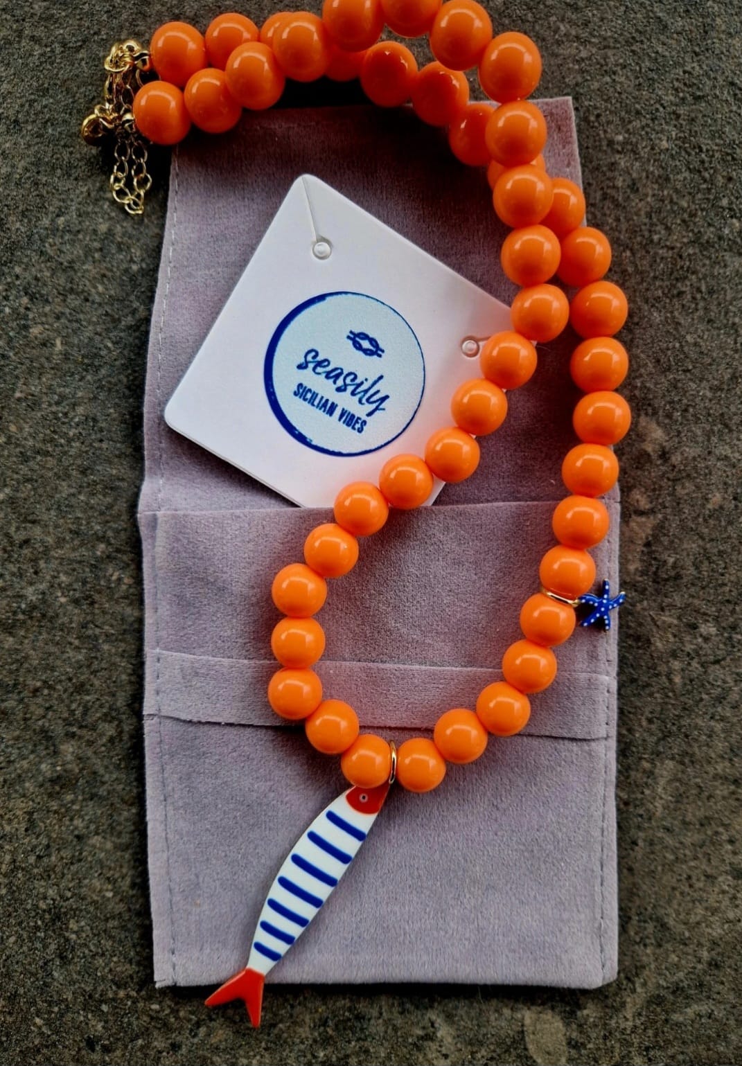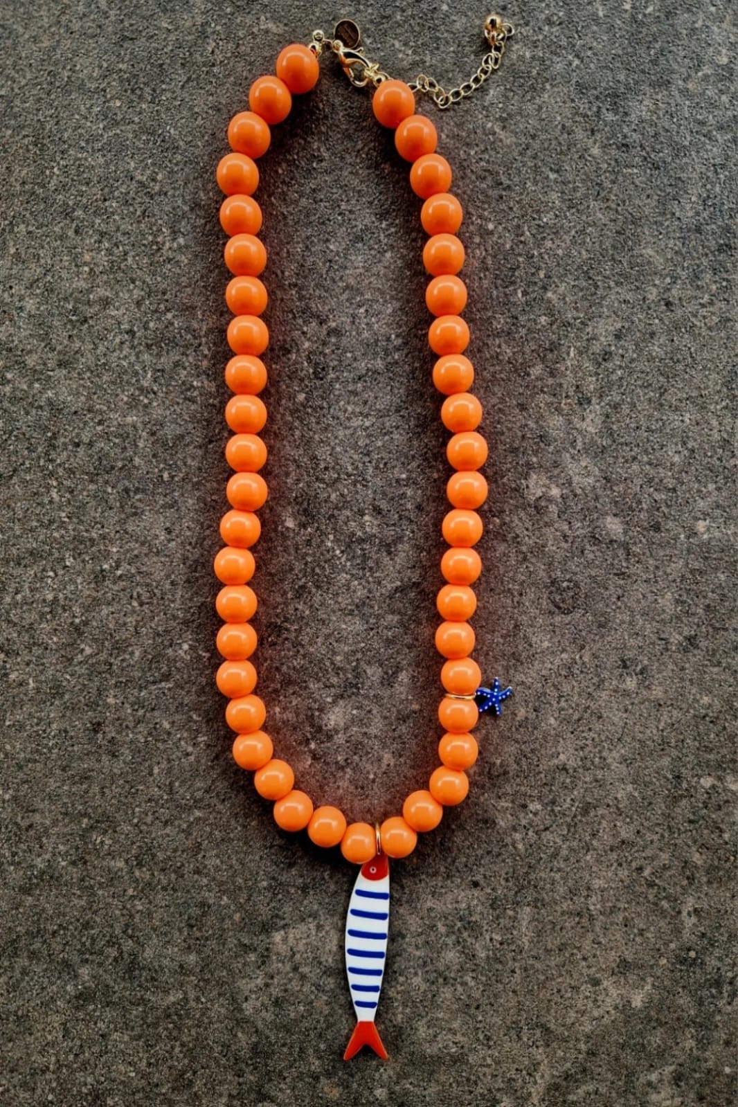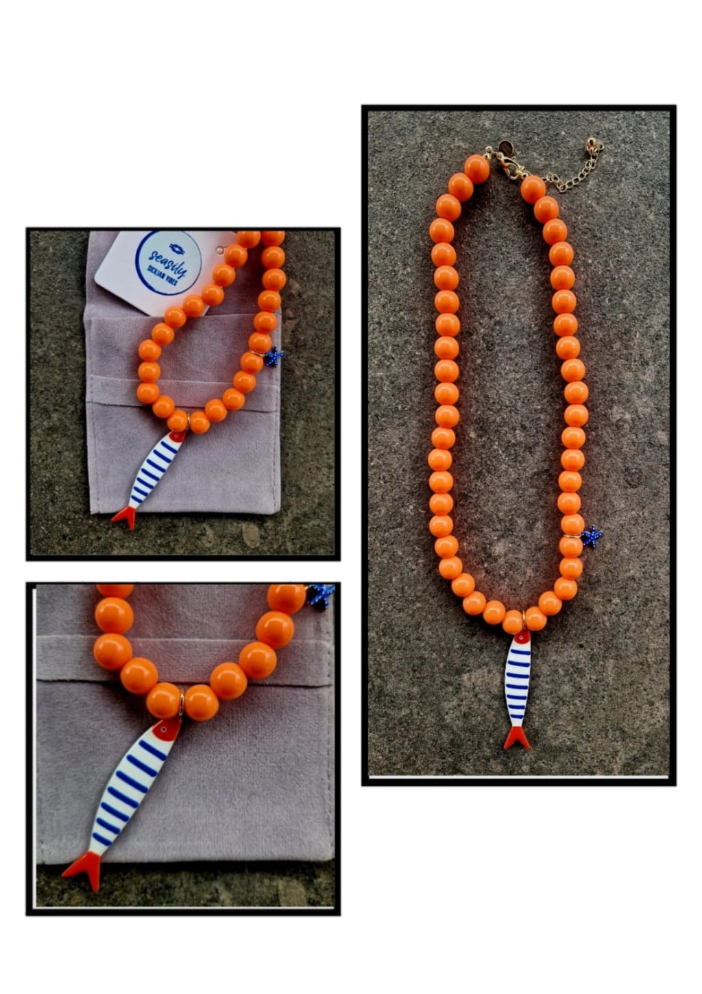Scopri il fascino del mare con la nostra collana Carassius! Con perle brillanti in acrilico arancioni e ciondoli smaltati sardina e stella marina, questa collana linea beads aggiunge un tocco di colore al tuo look. Perfetta per chi ama l'oceano e vuole portarlo sempre con sé.