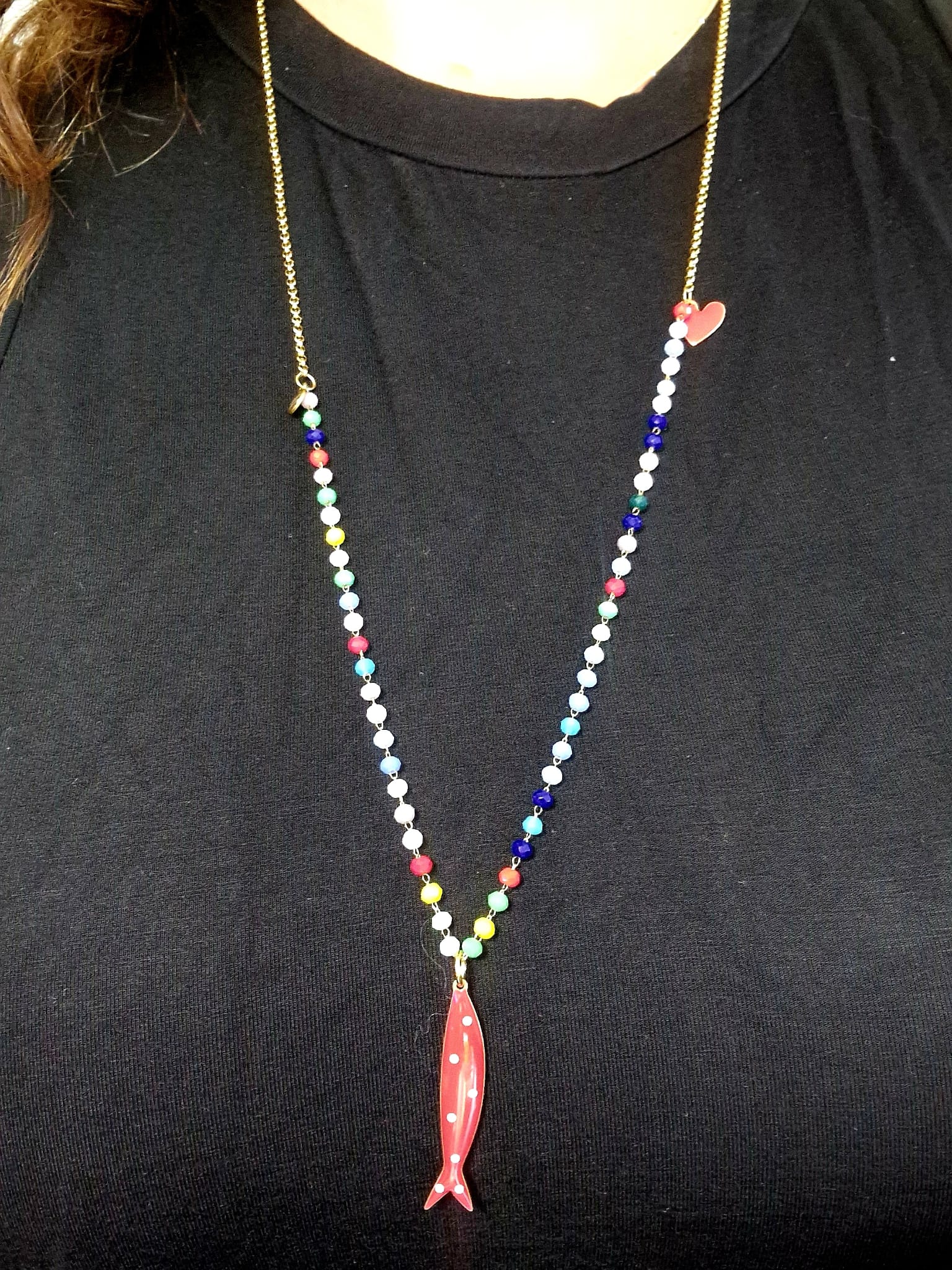 Questa collana lunga presenta un elegante mix di catenine dorate arricchite da perline sfaccettate multicolore. Il design è impreziosito da un distintivo pesciolino rosso a pois e un raffinato cuoricino smaltato, creando un accessorio versatile che aggiunge un tocco di colore e personalità a qualsiasi outfit.