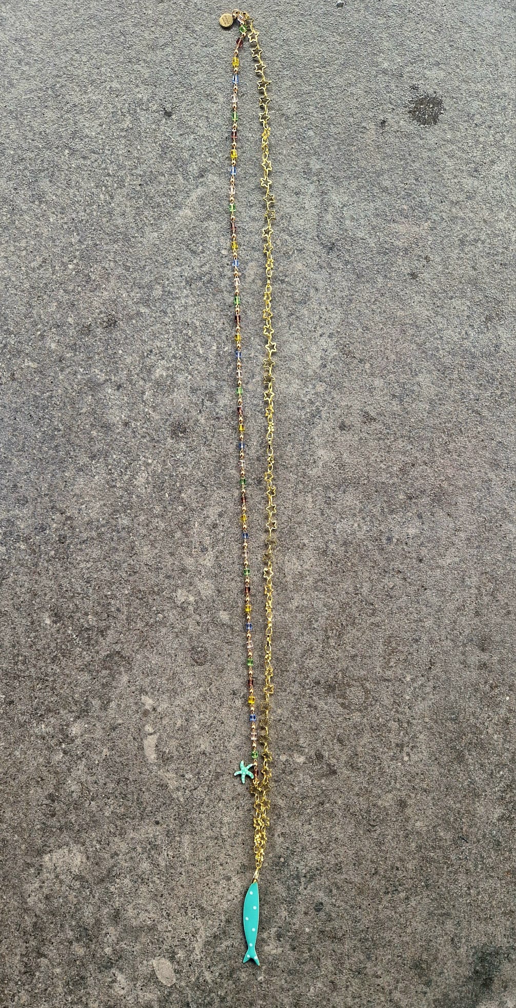 Esplora il tuo stile marino con la COLLANA MIX STAR. La catenina motivo stelle si unisce ad una catenina mix di perline in vetro dai toni naturali e ad un ciondolo smaltato a pois verde acqua rappresentante un pesce e una stella marina.