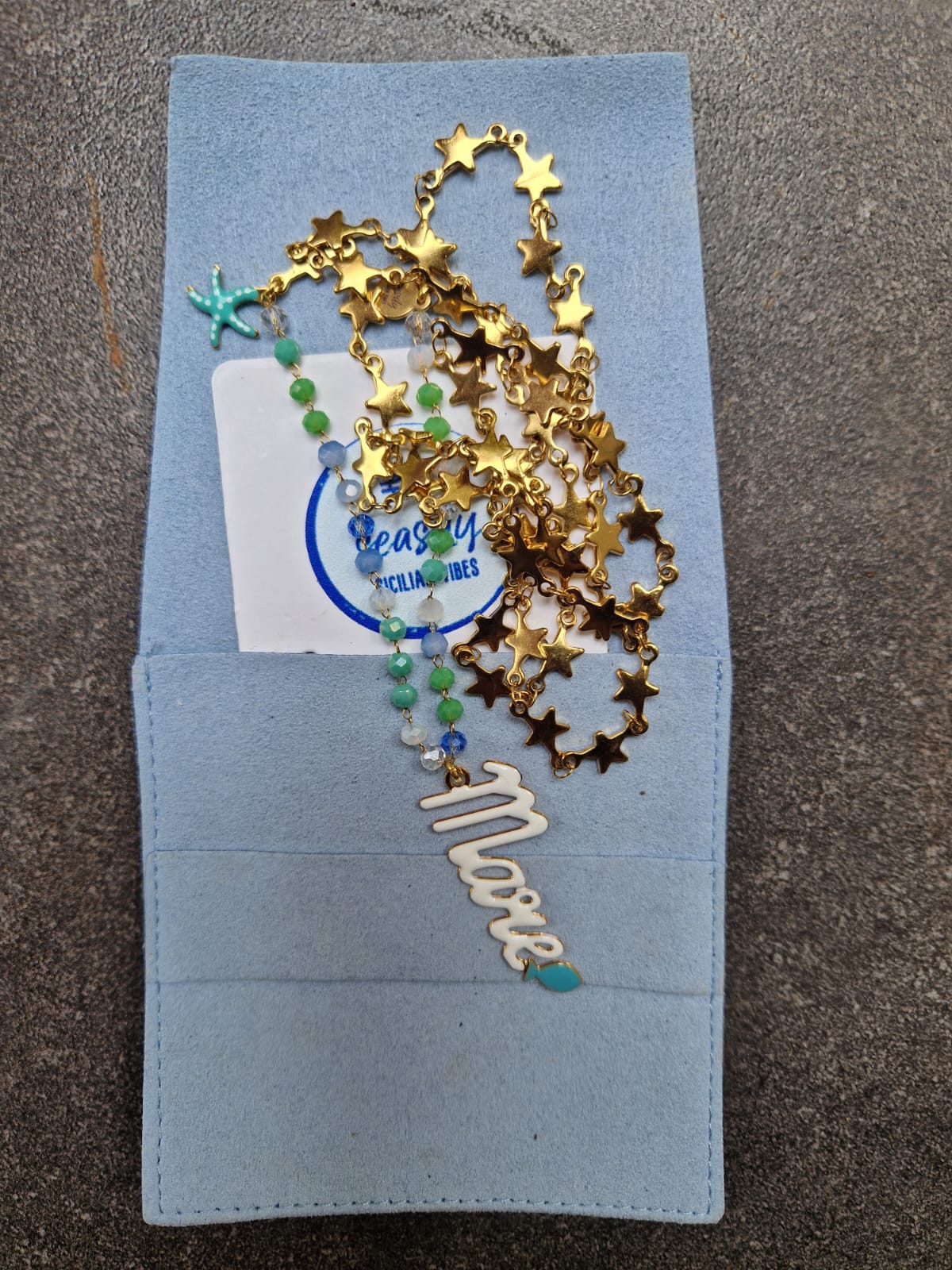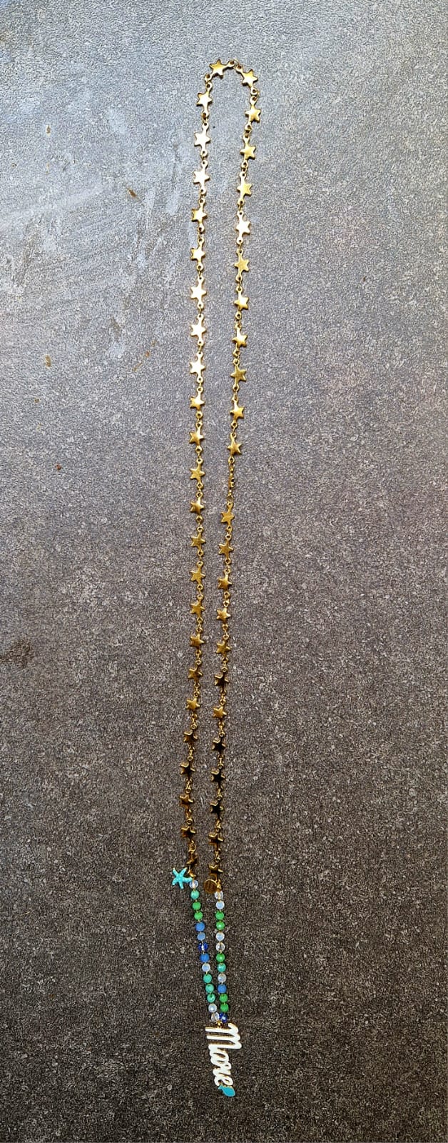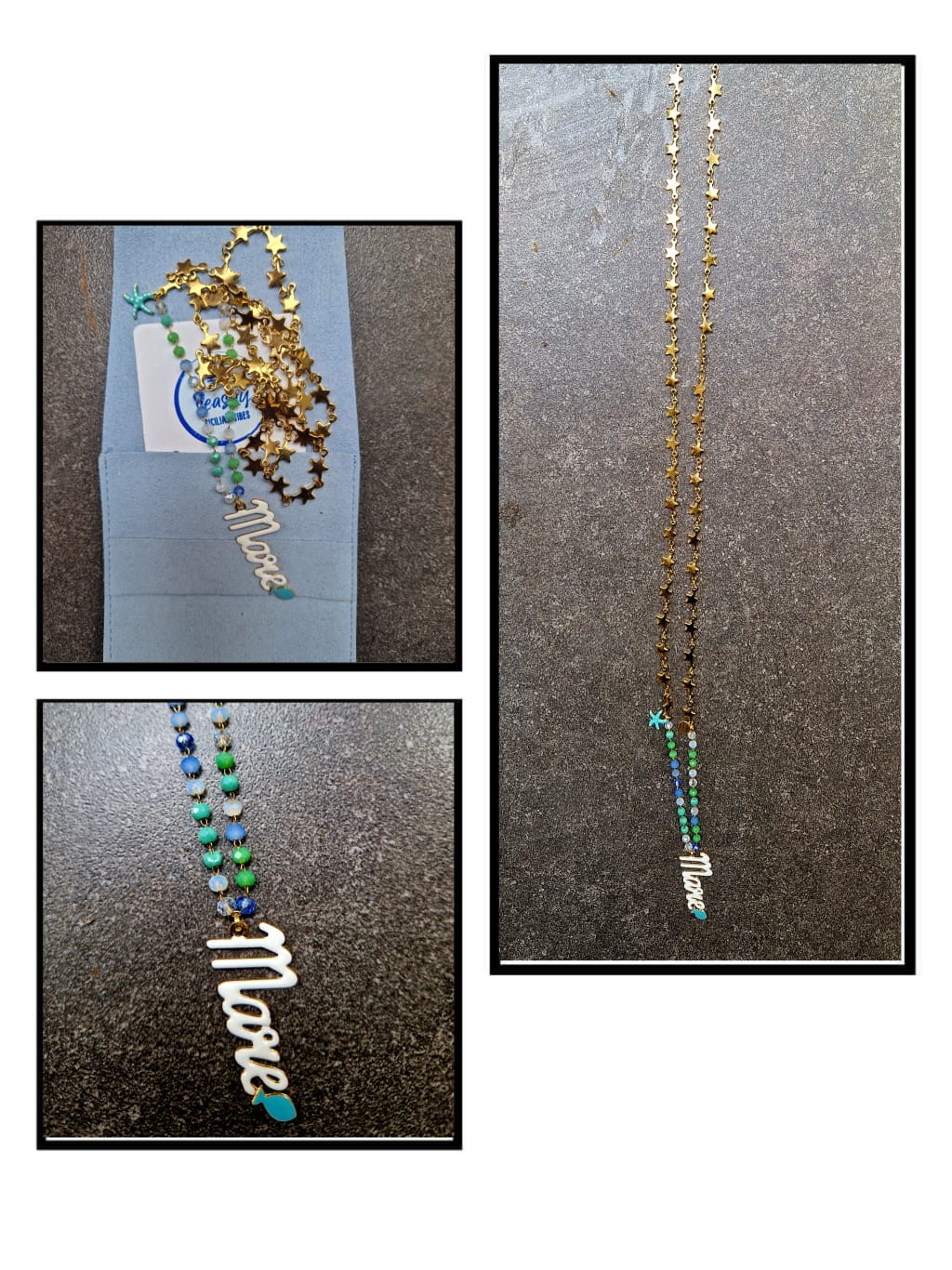 Aggiungi un tocco di colore ai tuoi outfit con la collana MAREBIANCO. Questo gioiello presenta una mix di catenine dorata e nei toni del mare, arricchita da un ciondolo smaltato con scritta bianca "mare" e un ciondolino a stellina rosso. Una scelta perfetta per un look originale e divertente.