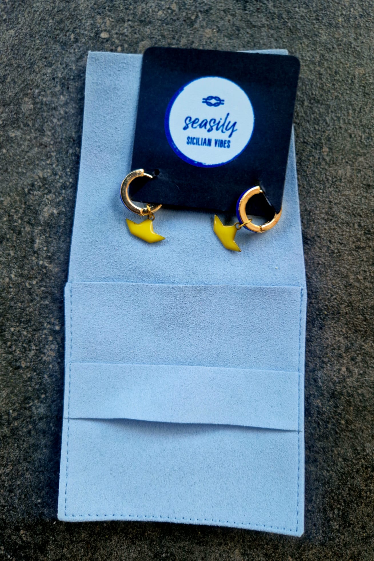 Porta un tocco di colore al tuo look con questi orecchini barchetta smaltati blu e gialli. Perfetti per chi ama i dettagli divertenti e unici, questi orecchini aggiungeranno un tocco di originalità al tuo outfit. Sono leggeri e comodi da indossare, perfetti per ogni occasione.