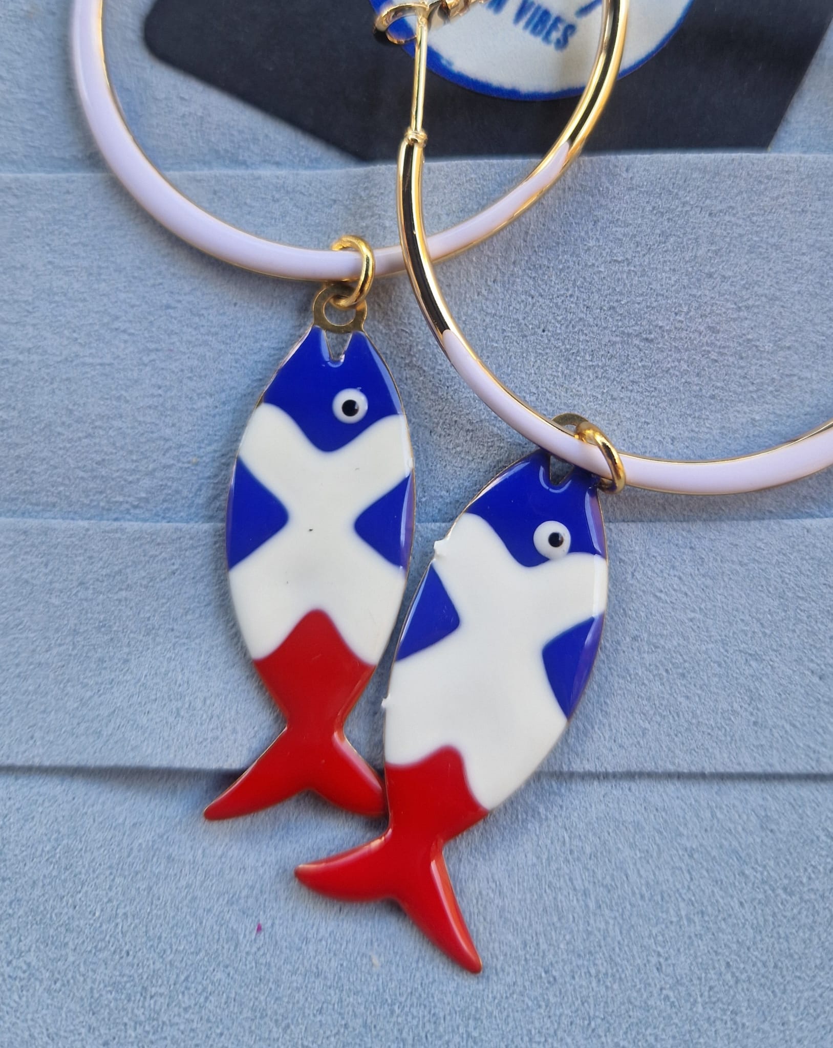 Aggiungi un tocco di colore al tuo look con gli ORECCHINI CIRCLE BIANCO. Questi orecchini a cerchio grande sono smaltati di colore bianco e sono impreziositi da pendenti a forma di pesce nei toni del bianco, rosso e blu. Ideali per un look divertente e originale.