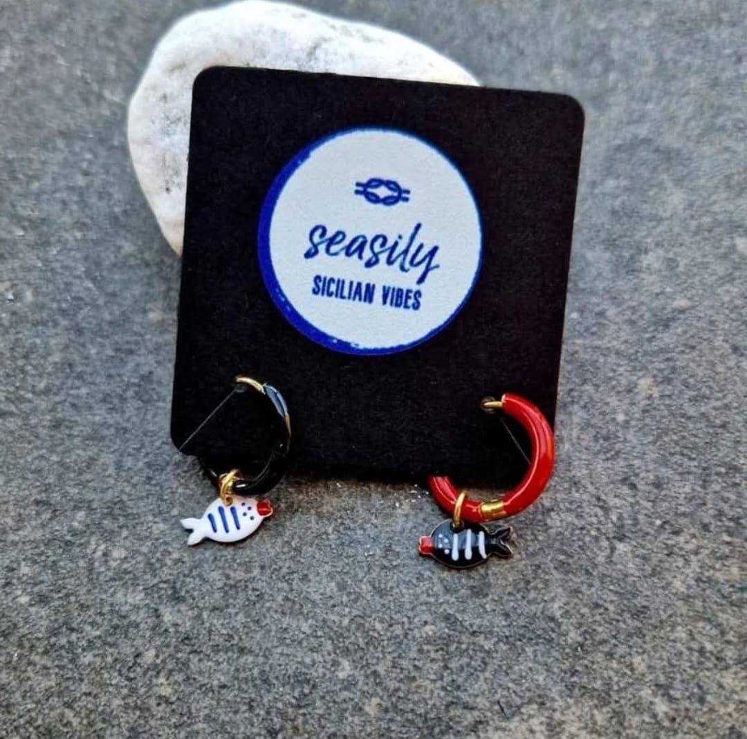 I nostri orecchini Complementary offrono un look unico con i loro colori a contrasto rosso e nero. I ciondolini smaltati a forma di pesciolini aggiungono un tocco di divertimento e originalità. Realizzati con materiali di alta qualità, questi orecchini sono perfetti per completare qualsiasi outfit con stile.